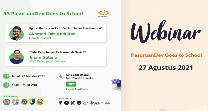 Nah, PasuruanDev Goes to School vol 03 ini akan membahas tentang salah satu jurusan IT di sekolah, yaitu TKJ dari mas Akhmad Faiz Abdulloh, seorang Linux Enthusiast. Eits gak cuma itu, mas Imam Sutono, Web Developer di detikcom juga akan berbagi tentang gimana sih cara mulai terjun dan belajar IT itu pada hari Jumat, 27 Agustus 2021 pukul 19.00-21.00 WIB.