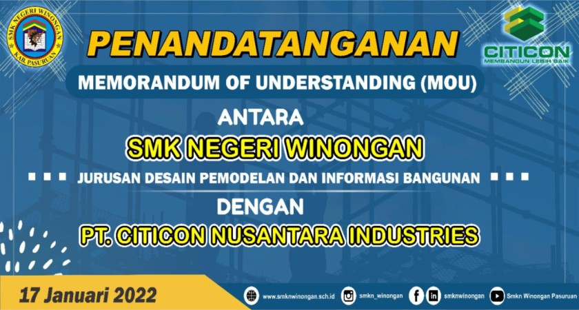 Kegiatan Pendatanganan Memorandum of Understanding (MOU) antara SMK NEGERI WINONGAN Jurusan Desain Pemodelan dan Informasi Bangunan (DPIB) dengan PT. CITICON NUSANTARA INDUSTRIES berjalan dengan lancar. Kegiatan penandatangan kontrak Kerjasama dilaksanakan pada hari Senin, 17 Januari 2022.